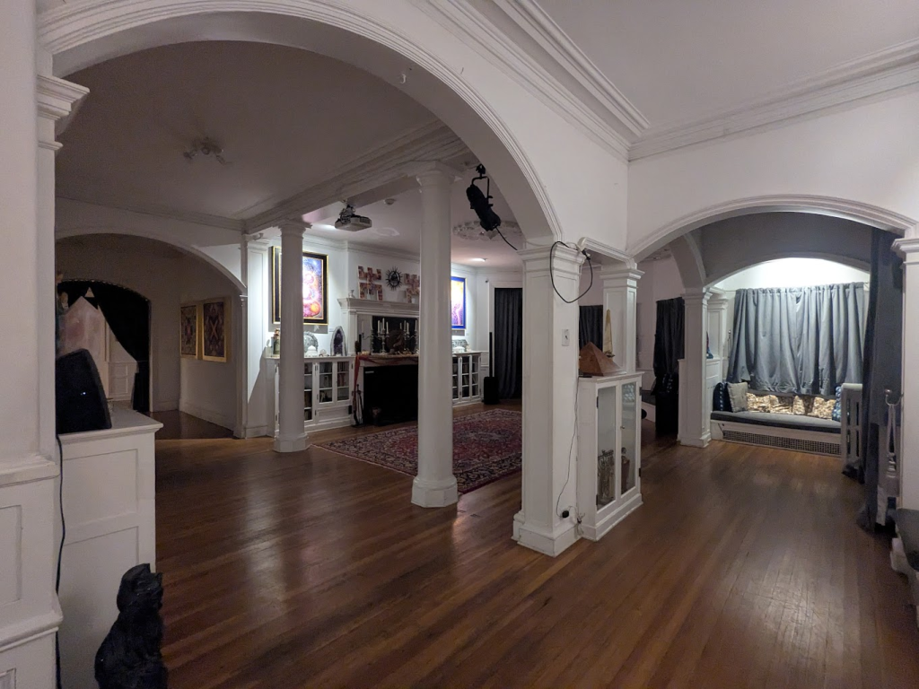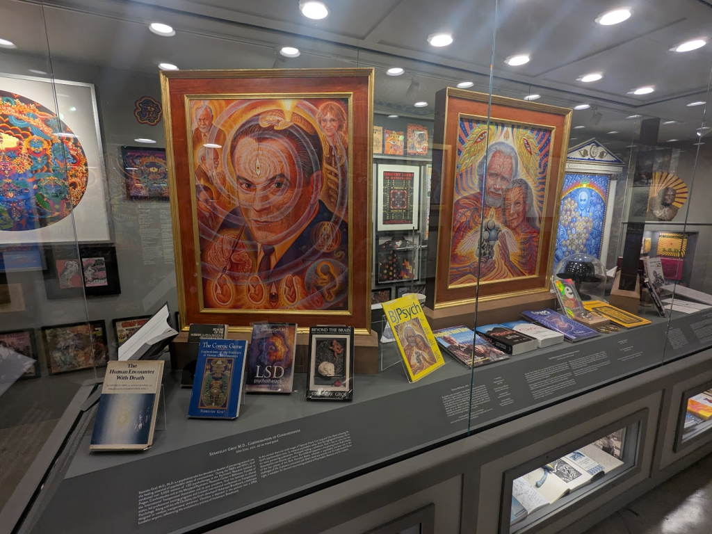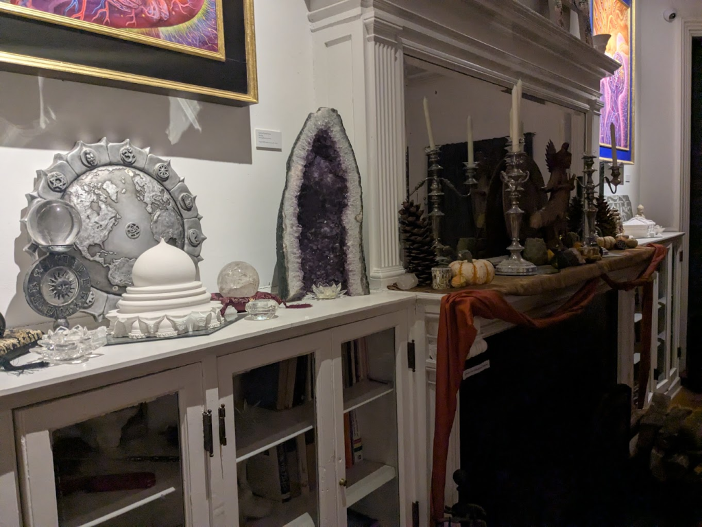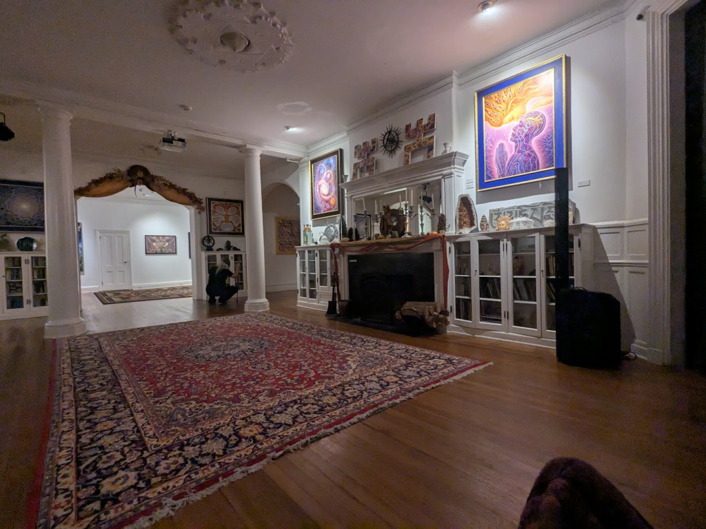 The ground floor features several large halls used as lecture and workshop spaces, also containing library collections and many works of psychedelic and visionary art.