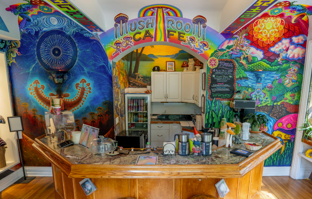 The extremely trippy Mushroom Cafe, where we purchased some non-entheogenic but very tasty spiced mushroom chips.