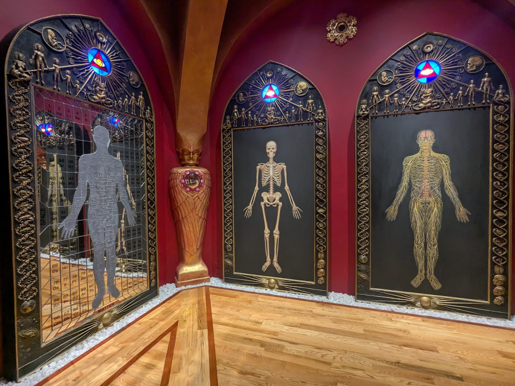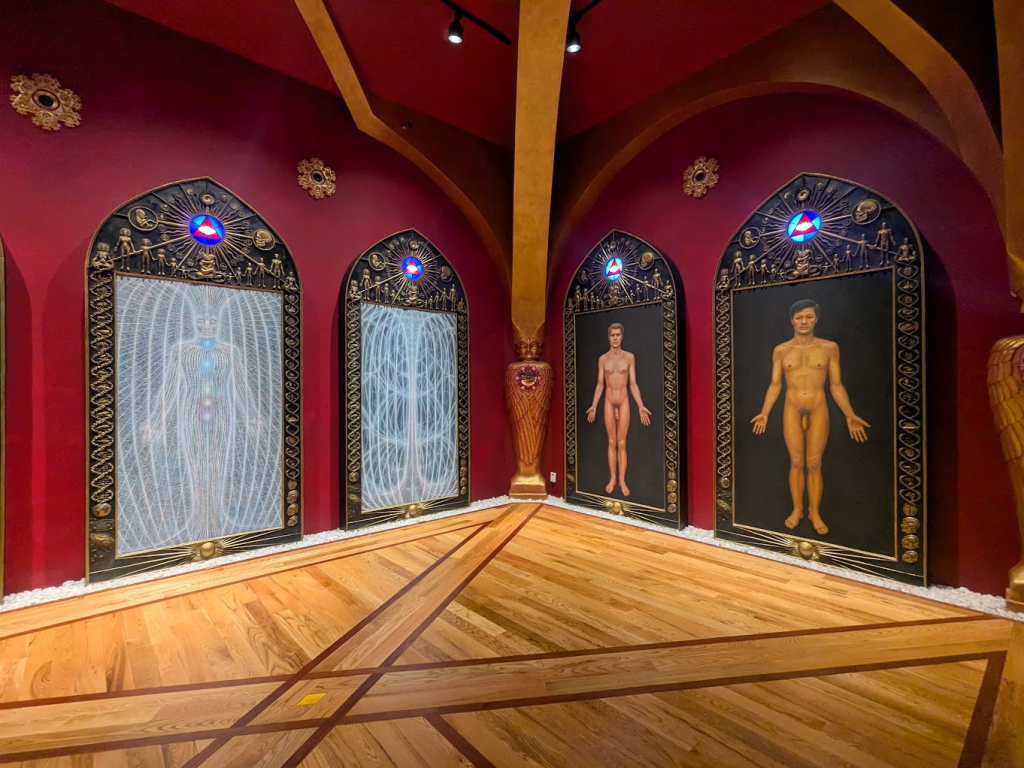 A section of the Chapel of Sacred Mirrors hall, each “mirror” depicting a different element of the human form from skeleton through the nervous system, lymphatic system, muscular system, etc. and then through to various ethereal and energetic states of being.