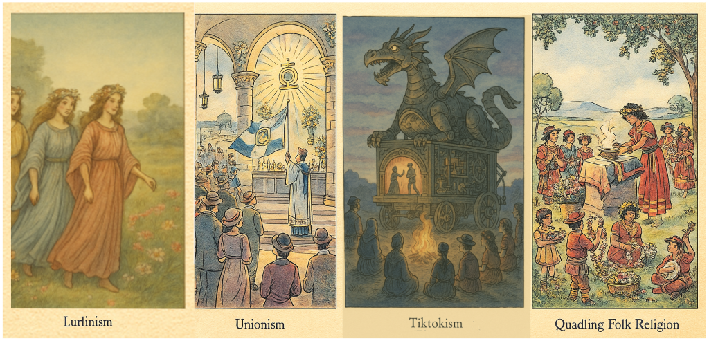The main cause of the decline of Lurlinism is the rise of Unionism, the monotheistic, institutional worship of the “Unnamed God” which serves as an analog of the Abrahamic religions. Maguire describes it as: