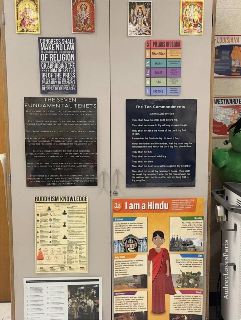 Children in this Texas classroom have a wonderful opportunity to learn something of the First Amendment, Islam, the Satanic Temple, Christianity, Buddhism and Hinduism thanks to this nifty display comparing various systems of religious and secular ethics.